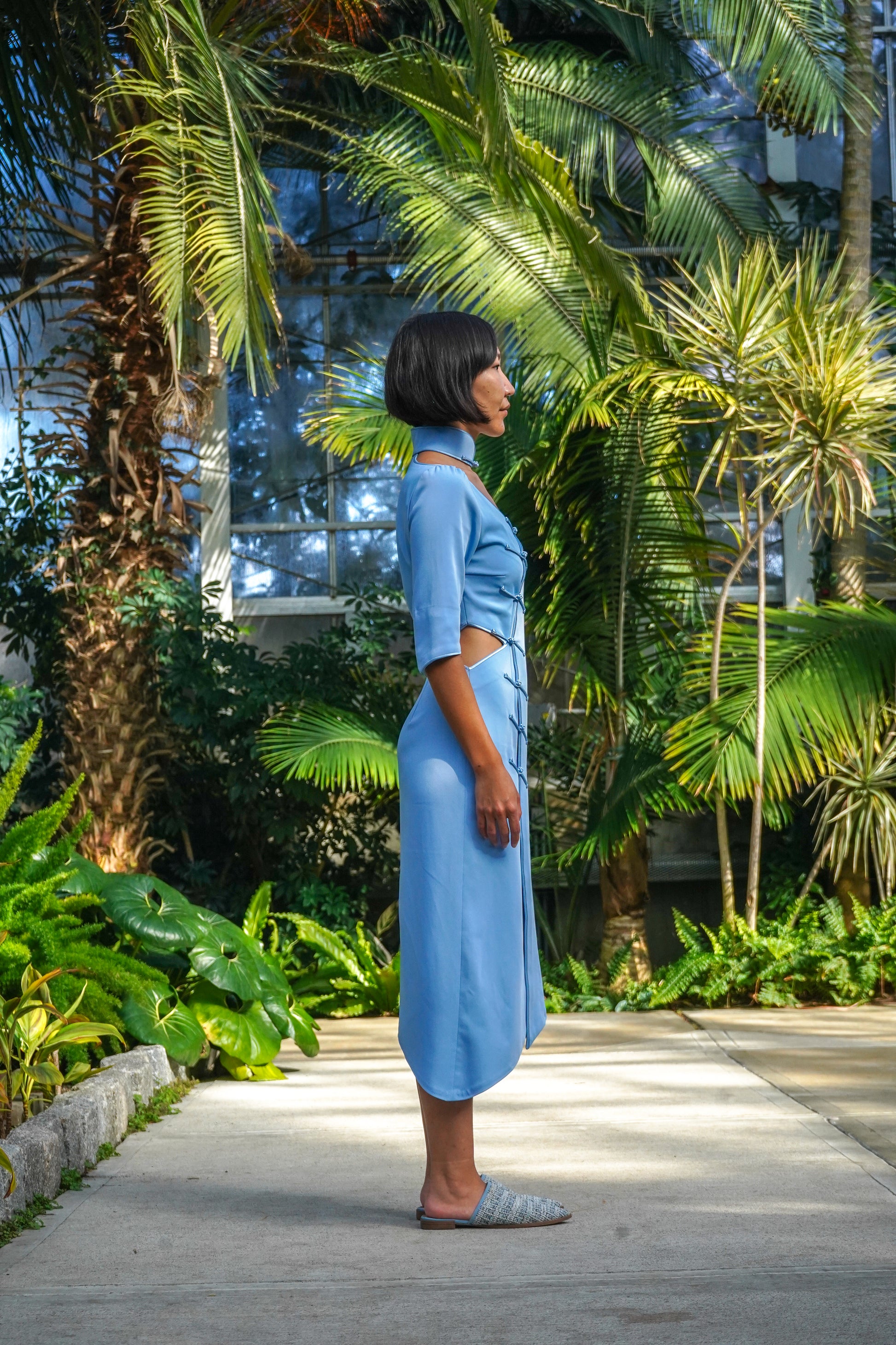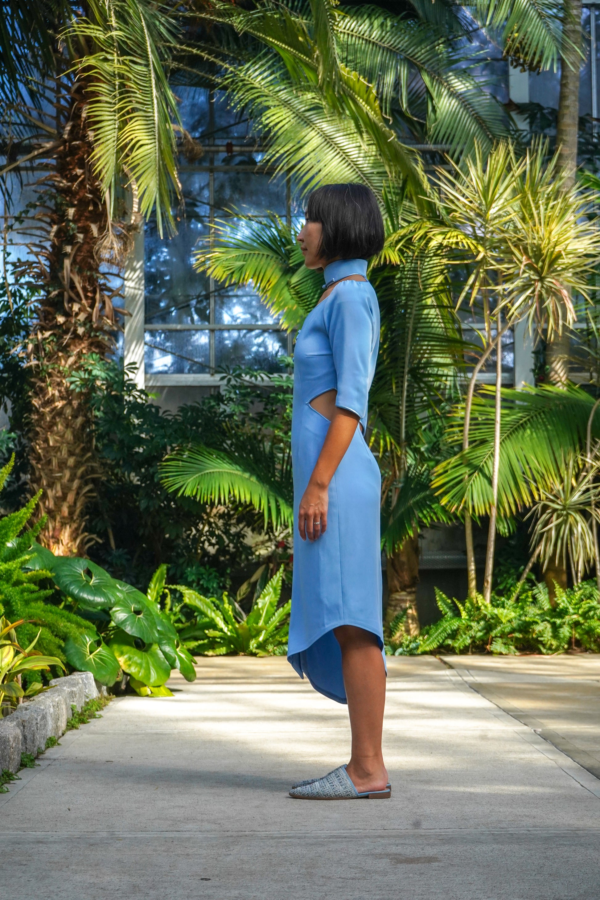 We made this 1st dress with a recycled polyester. However, we are really hoping to find the right weight of TENCEL, which is the first biodegradable breathable silky material, to make this for you. What we found haven't been thick enough to handle the unique hand sewn construction of this dress.